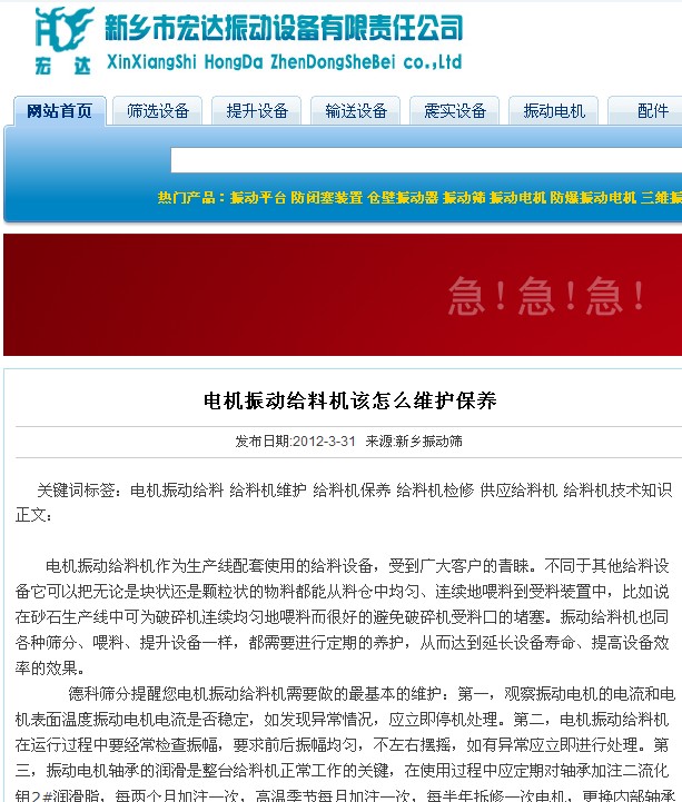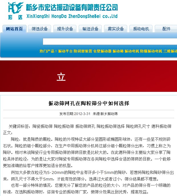 悲劇的全抄襲發(fā)生在2012年3月31日,由宏達(dá)振動(dòng)在其公司網(wǎng)站下發(fā)表同樣名稱的新聞,請(qǐng)看關(guān)鍵詞,赫然的德科篩分作為了他們新聞的關(guān)鍵詞。正文中提到“在此德科篩分主要給大家分享了陶粒具體的粒徑”,請(qǐng)看宏達(dá)網(wǎng)站的截圖。這種抄襲太拙劣了,毫無(wú)自己的思維。同日,低劣的全抄襲不僅僅為這一篇。德科不反對(duì)技術(shù)分享,但請(qǐng)?jiān)谀窒淼幕A(chǔ)上尊重自己和同行。